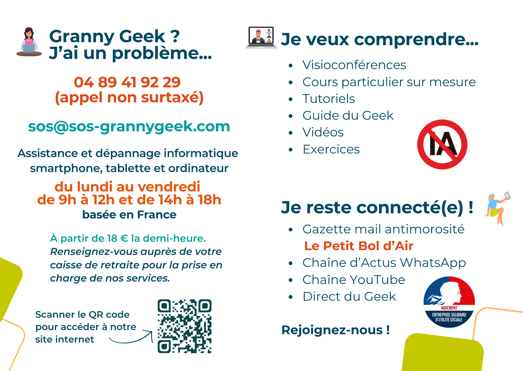 Nous nous adressons aux seniors, à leurs aidants, ainsi qu'aux entreprises et associations souhaitant faciliter l'inclusion numérique. Nous proposons une gamme complète de services : assistance à distance pour le dépannage, conseils personnalisés, fiches pratiques, mini-tutoriels pas-à-pas, guide complet sur WhatsApp ou sur Linux, et même un lexique numérique pour comprendre le jargon informatique. Pour égayer le quotidien et rester connecté, nous envoyons également une gazette 'antimorosité' permettant de voir tous les côtés positifs du numérique. Nous organisons des visioconférences thématiques et un Direct du Geek hebdomadaire accessible à tous.